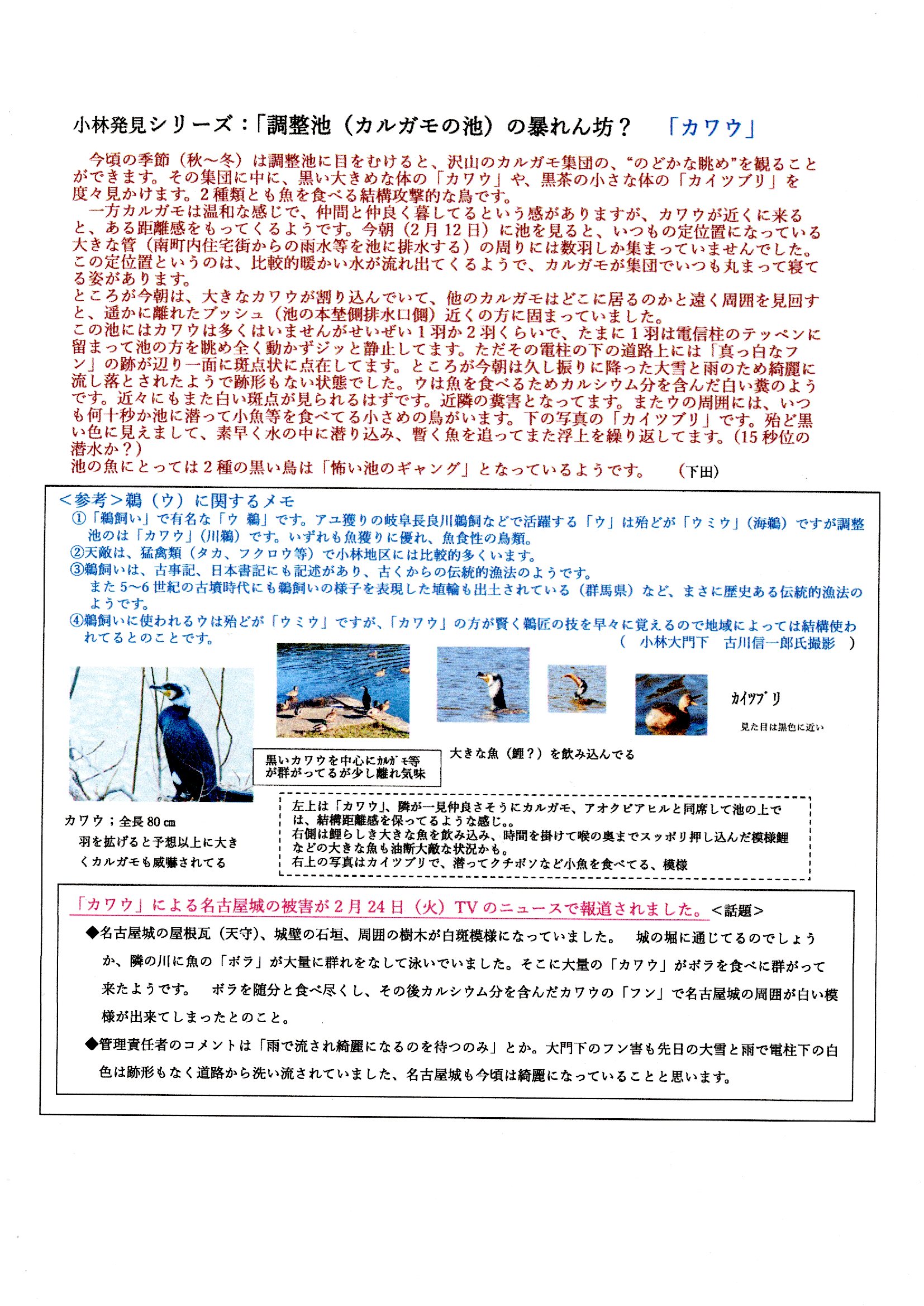 小林大門下にある調整池には多くのカルガモが泳いでいます。秋から冬に数多く居て、調整池の畔に「小林鯉のぼり」が泳ぎ始める頃に繁殖のために、近くの里山に移り住んで、秋にまた戻ってきます。そんな調整池を通称「カルガモの池」と呼んでいます。この池には、カルガモの他、アオクビアヒル、コサギ、カワセミも居ますし、チュウサギ、ダイサギ、まれですがハクチョウやコブハクチョウも見ることがあります。そんな中、カワウを最近見かけます。