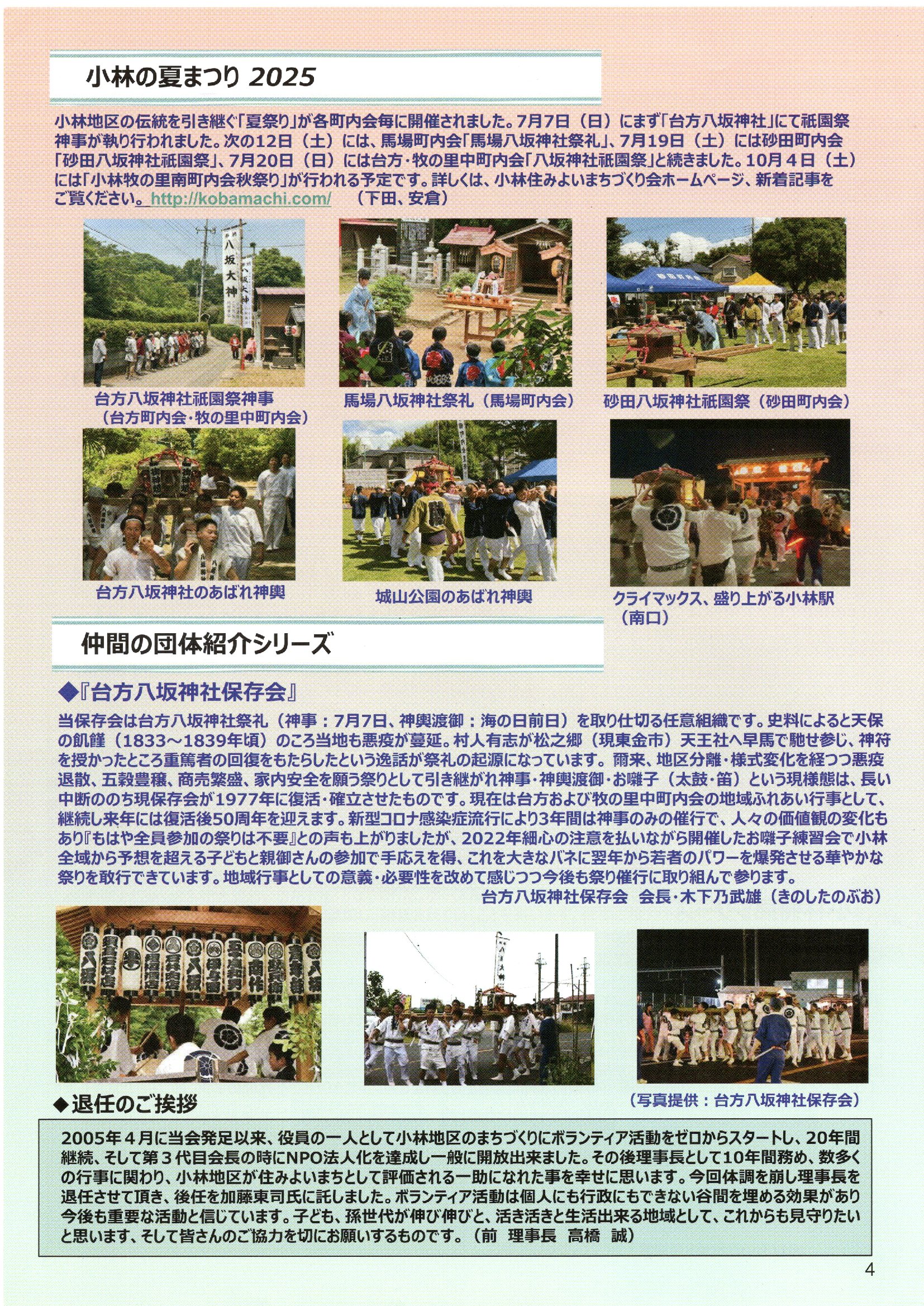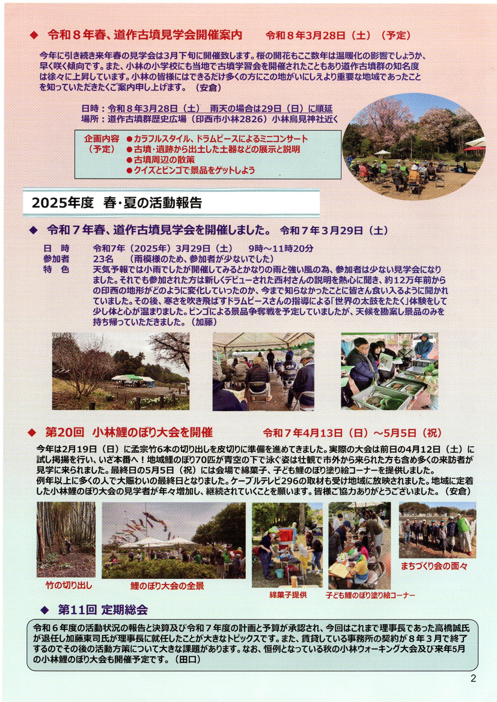 瓦版38号 2025.10.1の発刊について 2025 10/01 地域交流 小林ウオーキング大会・道作古墳見学会 小林住みよいまちづくり 瓦版(機関誌) 2025.10.01 地域交流 小林ウオーキング大会・道作古墳見学会 小林住みよいまちづくり 瓦版(機関誌) 今年も「小林地区のお祭り」が始まりました。 第22回 小林ウオーキング大会及び道作古墳見学会の開催予定 関連記事 ふれあいパラソル再開 2015.04.04 今日もパラソルを開催しました 2015.05.09 小林地区の夏祭り 2015.08.17 第19回ふれあい新春お楽しみ会が青空のもと開催されました 2016.01.11 1月8日(日)に「ふれあい新春お楽しみ会」が開催されます 2016.12.12 第20回ふれあい新春お楽しみ会 開催される 2017.01.09 小林まちづくり瓦版 第1号 創刊号(2006.3.27) 2018.01.01 小林まちづくり瓦版 第2号(2006.10.29) 2018.01.02