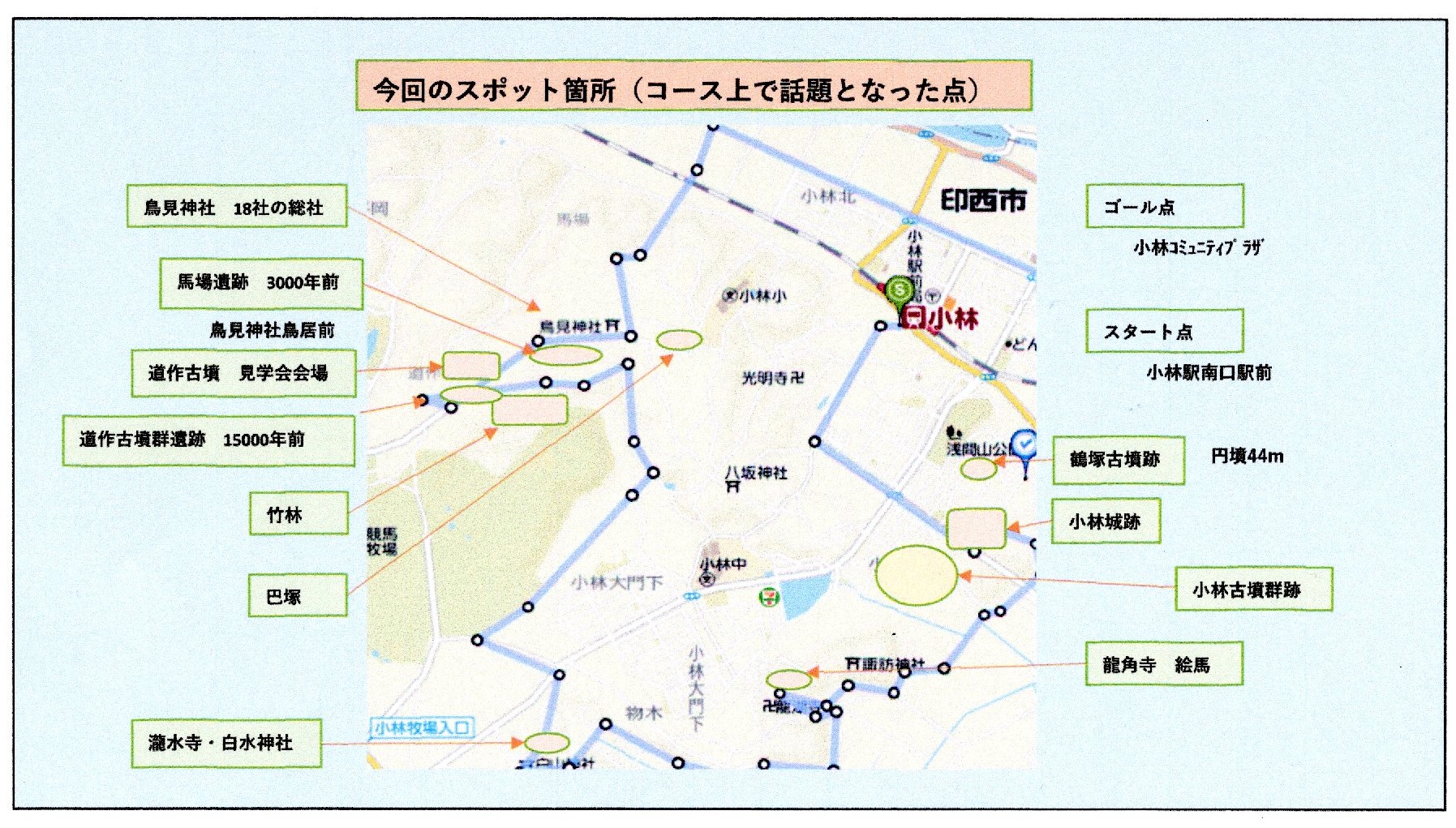 今回のウオーキングコースは、すでにHPに掲載してる「MAP」のとおりで約8kmと若干長めでしたが、比較的平坦なコースで途中2万7千年前の旧石器時代の「瀧水寺裏遺跡」(30年前位の工事で現在は県道)や、鳥見神社鳥居の直前に在った「馬場遺跡」(3,000年 縄文時代後期に超大型の土坑が在った。今は市道)などすぐ脇を通るなど多くの古墳跡、遺跡の直近を味わうことができたのではないでしょうか。