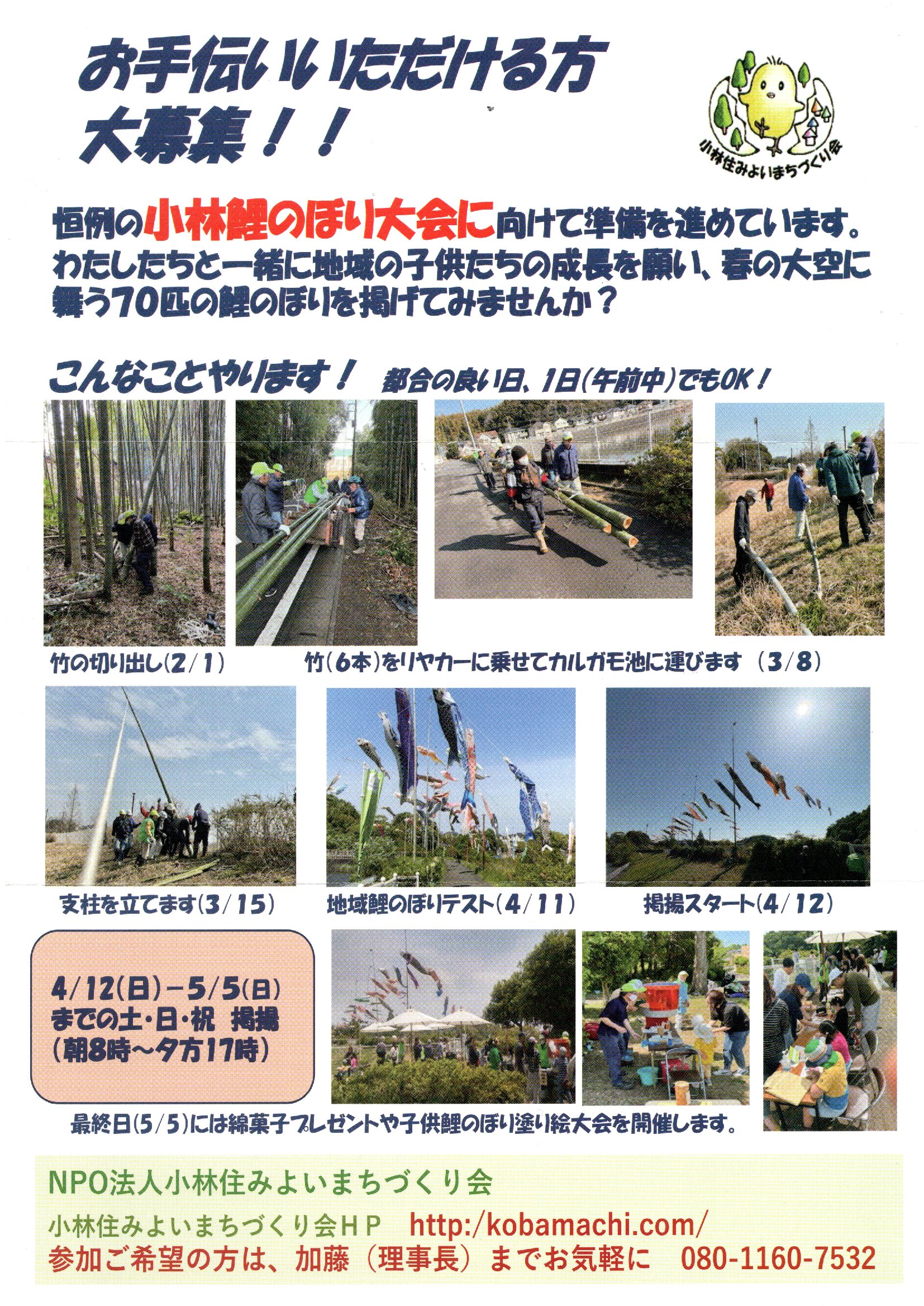小林鯉のぼり大会 4月12日~5月5日を今年も開催します。つきましては鯉のぼり掲揚などの「作業」をお手伝いして頂ける方を募集しております